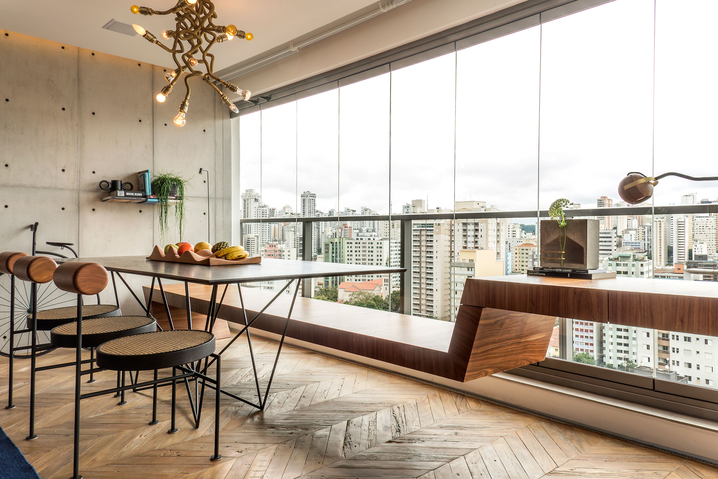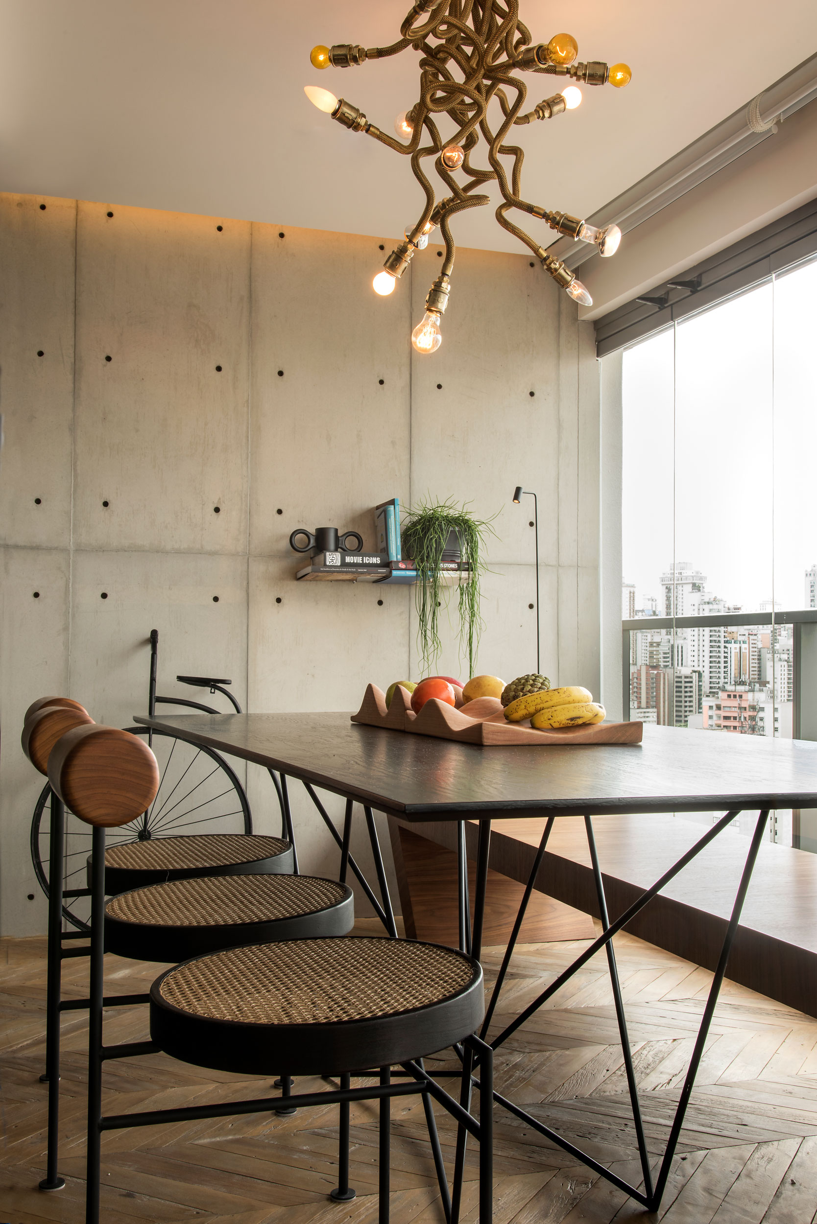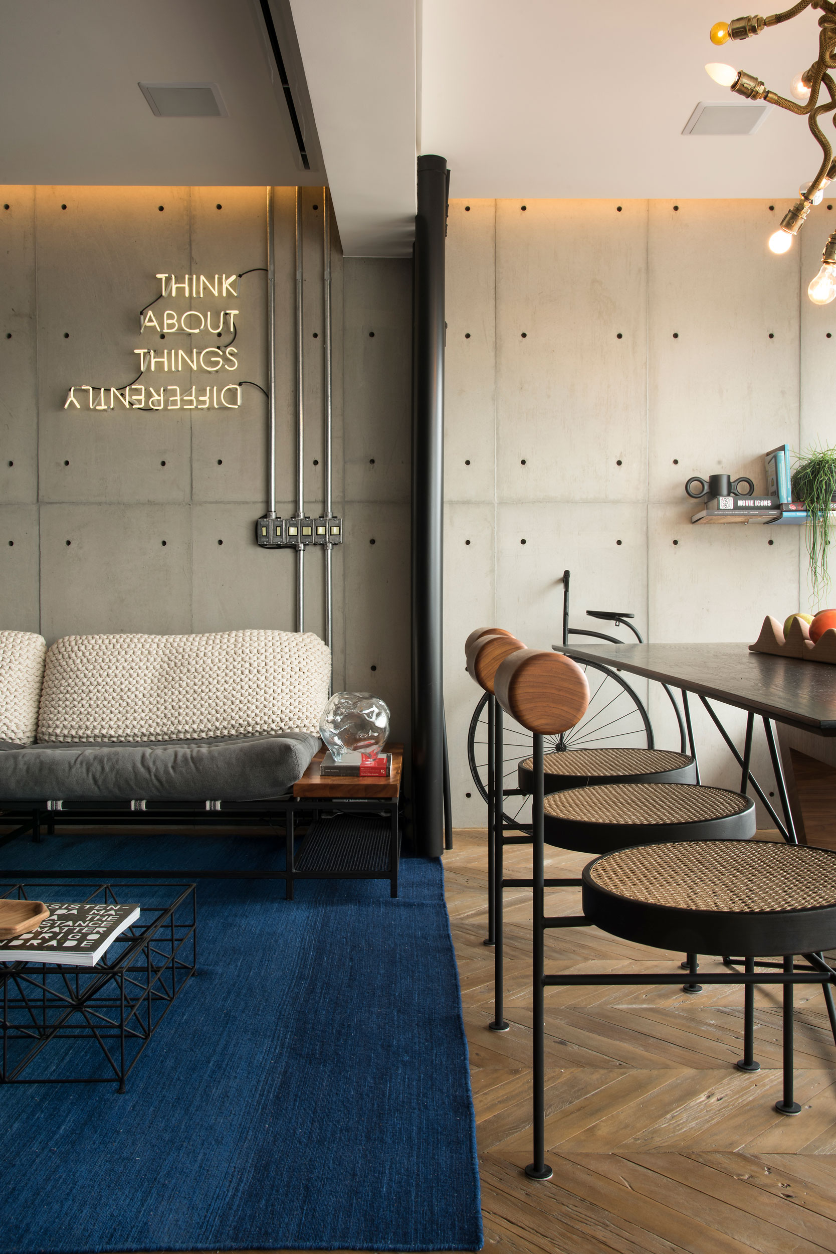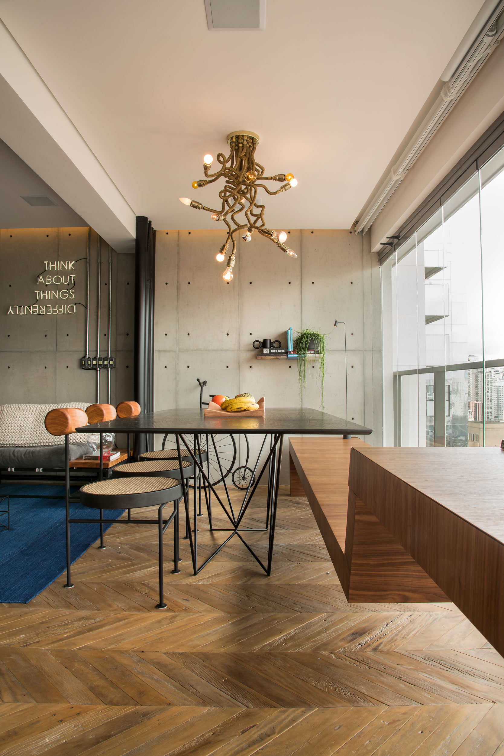 Apartamento com metragem quadrada reduzida e grande aproveitamento dos espaços. A integração do terraço com a área interna e a conexão entre os ambientes, foram as premissas para a concepção do projeto. A importante definição dos materiais e mobiliários criou uma unidade de linguagem e uma conversa entre todos os espaços. Concreto, madeira de demolição e metal são os protagonistas. A ressignificação de alguns deles fez parte desse conceito, como a lona de caminhão na cabeceira e a tubulação de gás no lustre do jantar. Além dos materiais, os desenhos, que desenvolvemos exclusivamente para esse apartamento, da estante metálica e do banco, são peças fundamentais. O banco do jantar se transforma em escrivaninha, já a estante metálica vazada, conecta o living com o quarto. Os painéis em marcenaria possuem também uma função importante, a área de serviço fica escondida atrás deles, sem precisar deixá-la exposta.