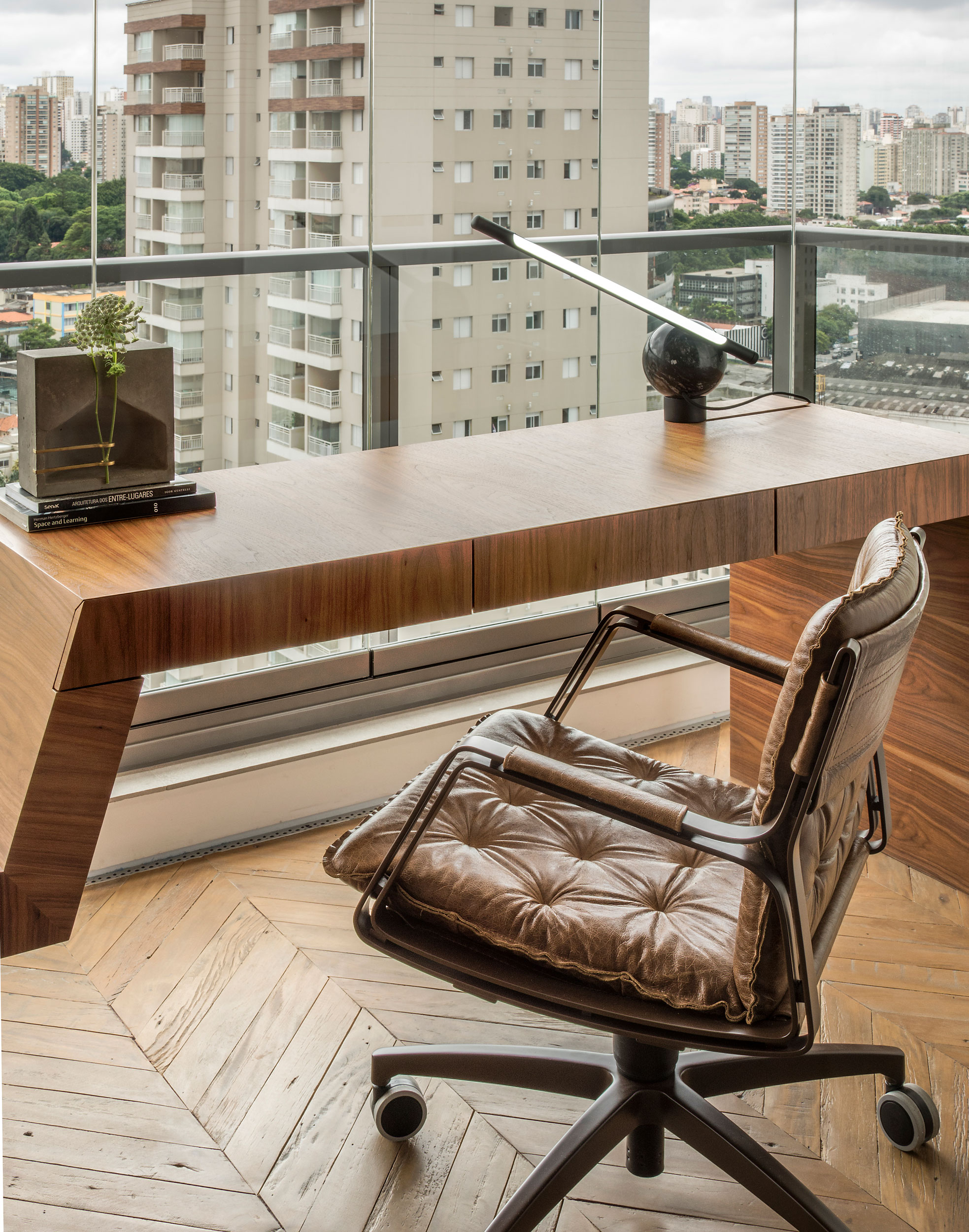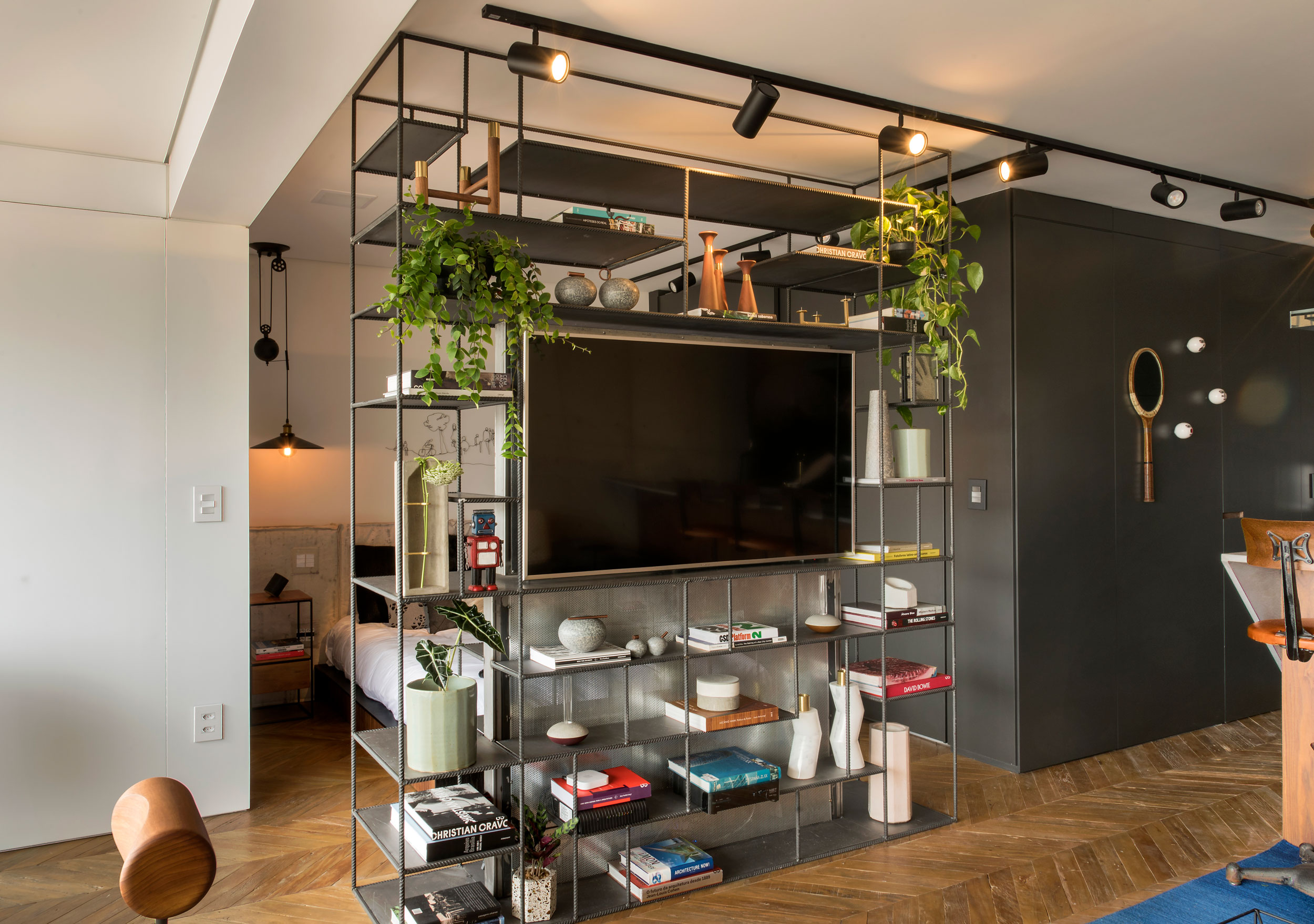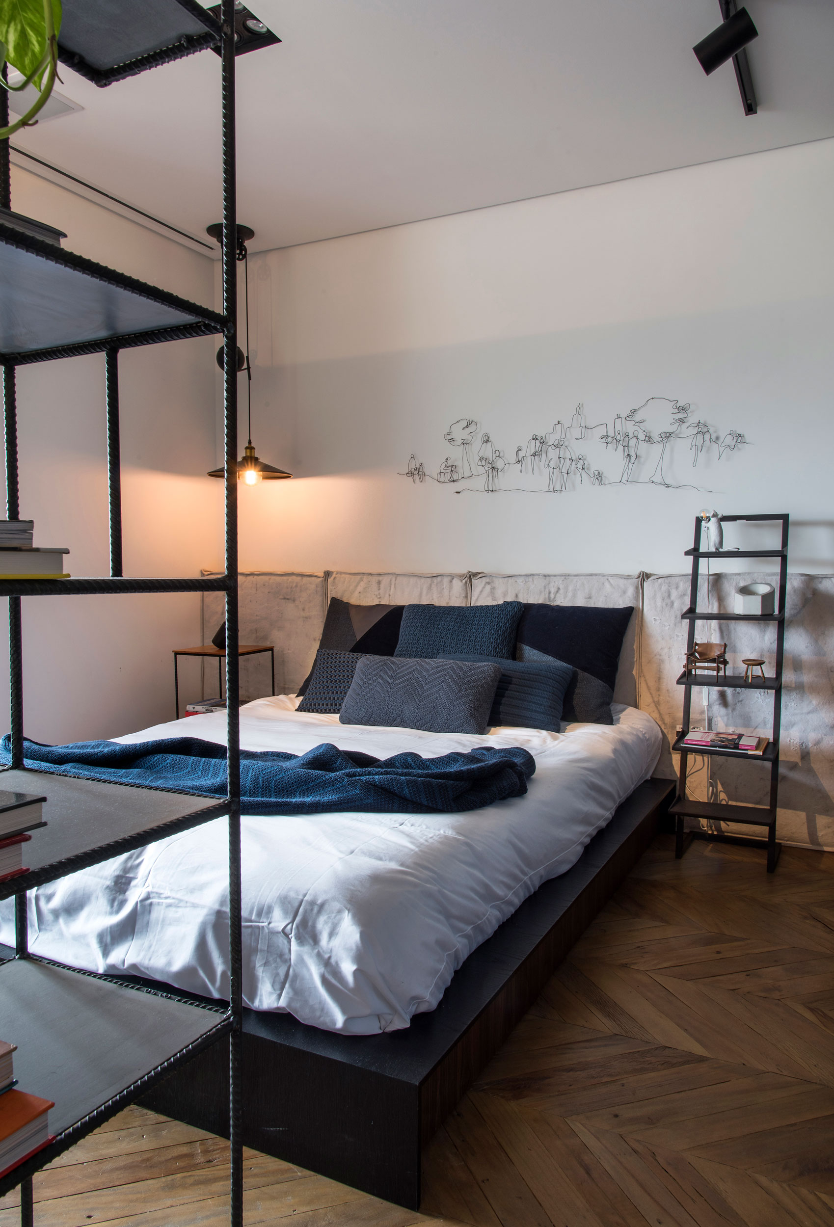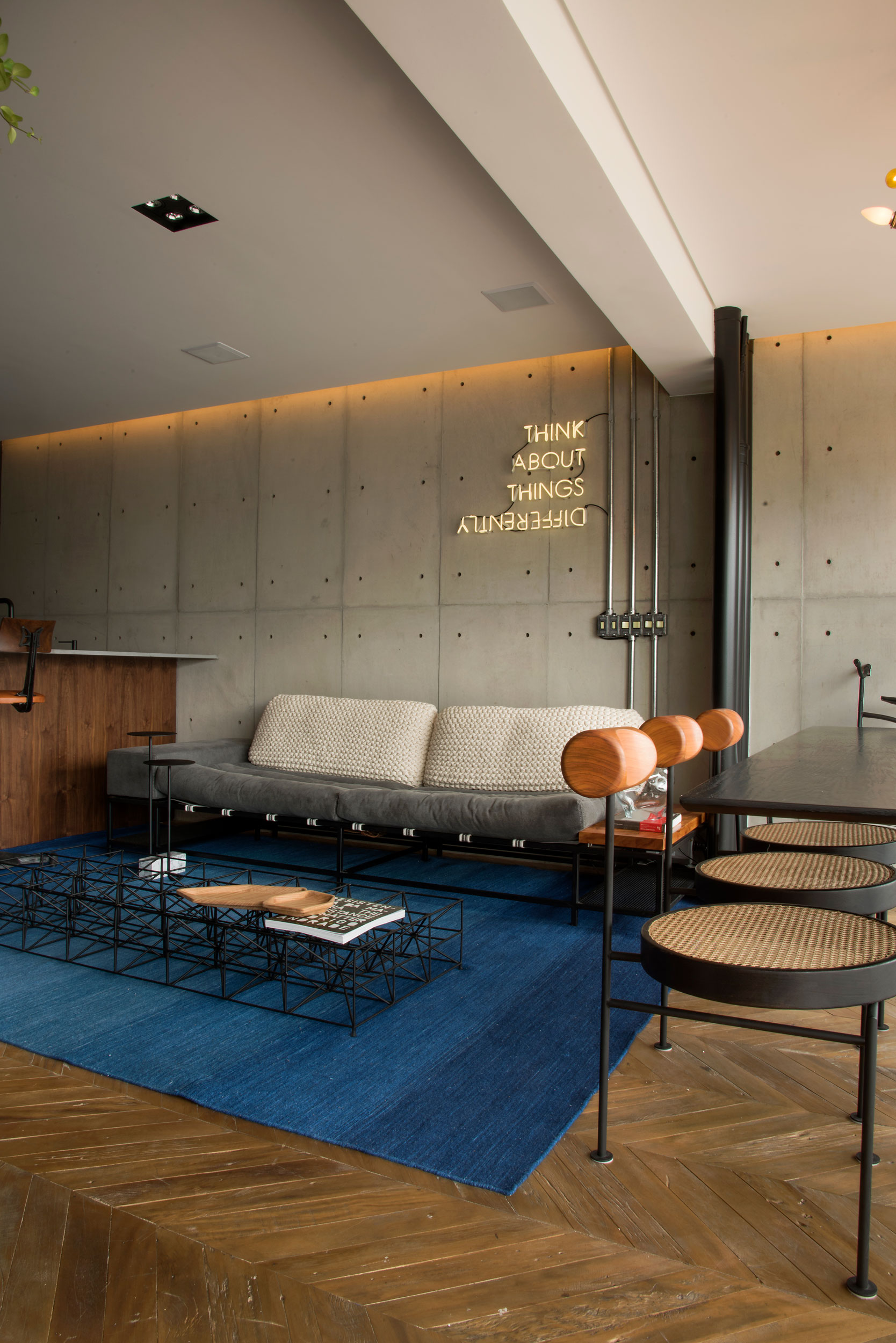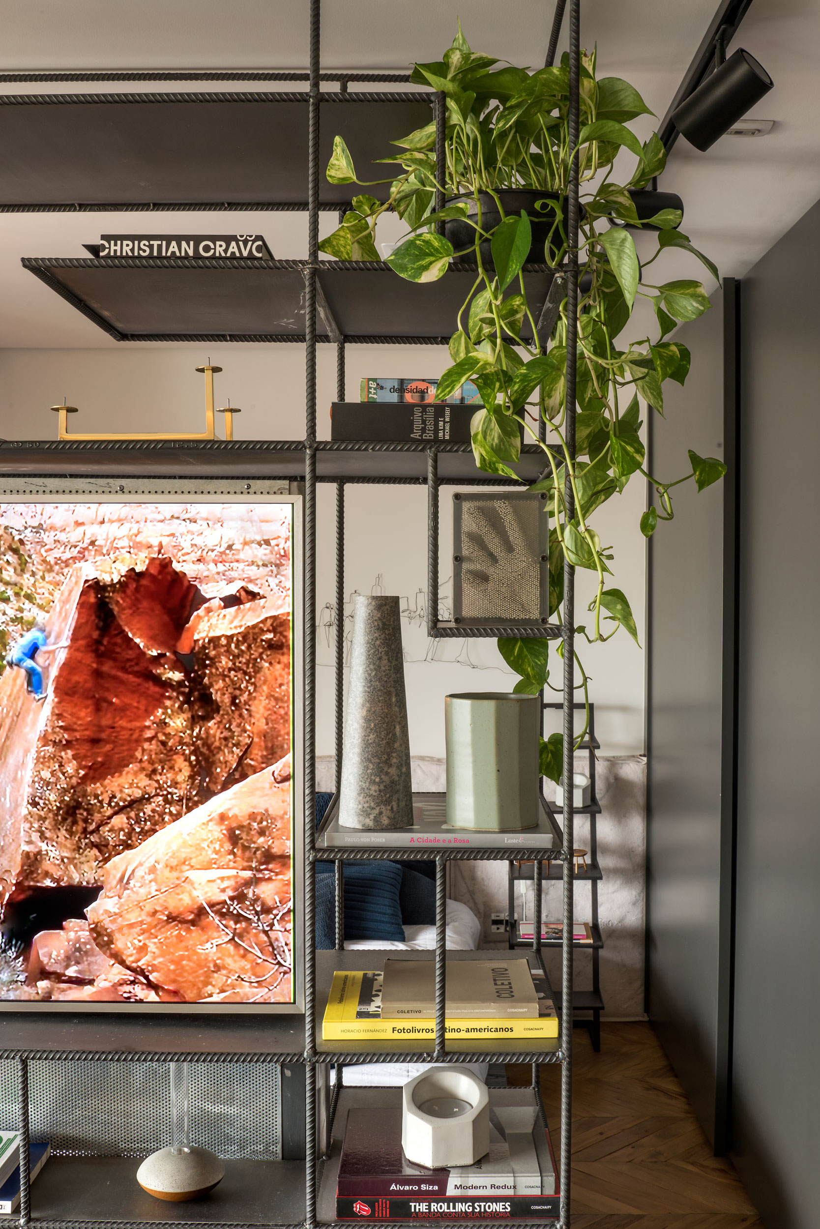 Apartamento com metragem quadrada reduzida e grande aproveitamento dos espaços. A integração do terraço com a área interna e a conexão entre os ambientes, foram as premissas para a concepção do projeto. A importante definição dos materiais e mobiliários criou uma unidade de linguagem e uma conversa entre todos os espaços. Concreto, madeira de demolição e metal são os protagonistas. A ressignificação de alguns deles fez parte desse conceito, como a lona de caminhão na cabeceira e a tubulação de gás no lustre do jantar. Além dos materiais, os desenhos, que desenvolvemos exclusivamente para esse apartamento, da estante metálica e do banco, são peças fundamentais. O banco do jantar se transforma em escrivaninha, já a estante metálica vazada, conecta o living com o quarto. Os painéis em marcenaria possuem também uma função importante, a área de serviço fica escondida atrás deles, sem precisar deixá-la exposta.