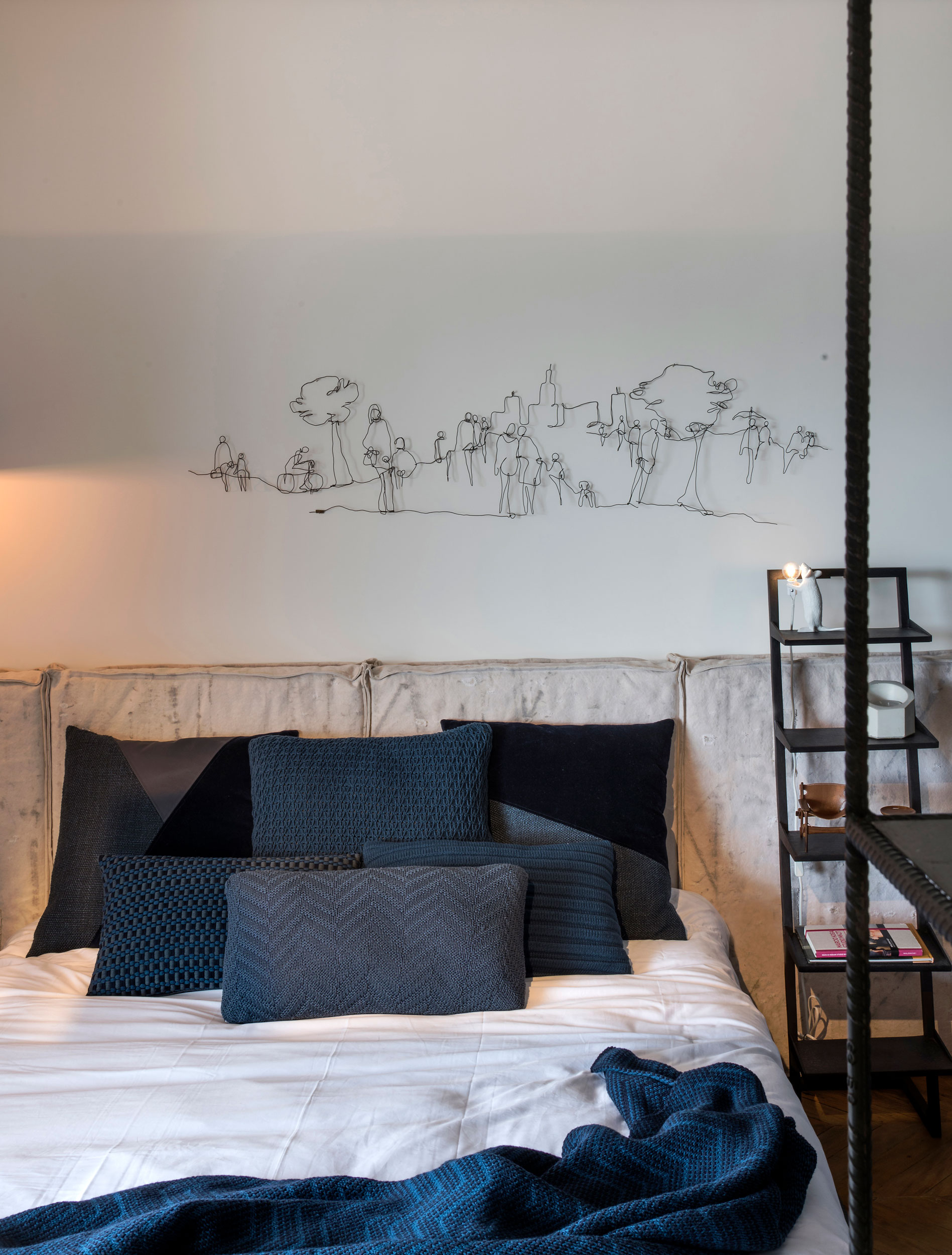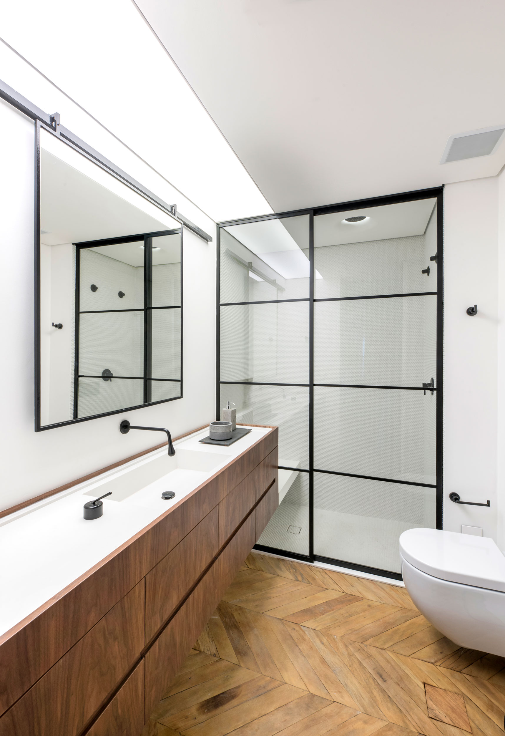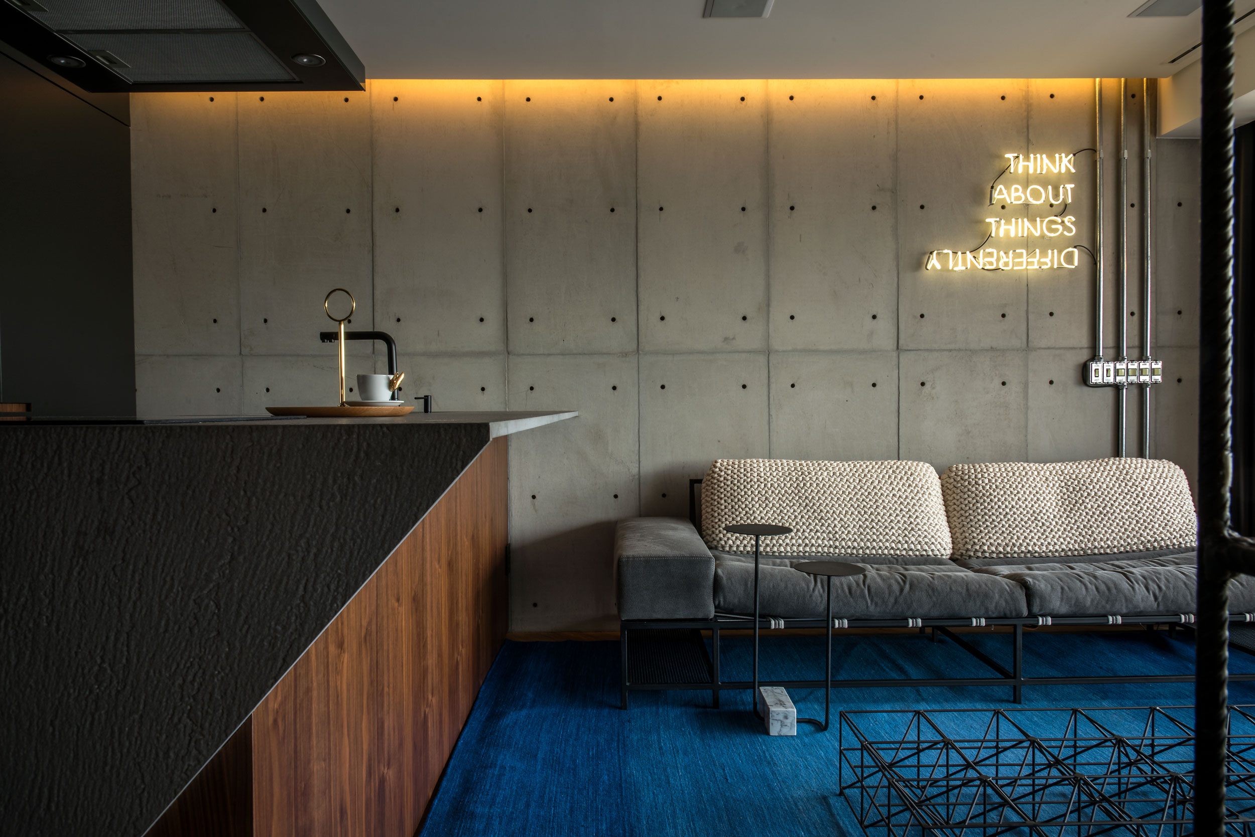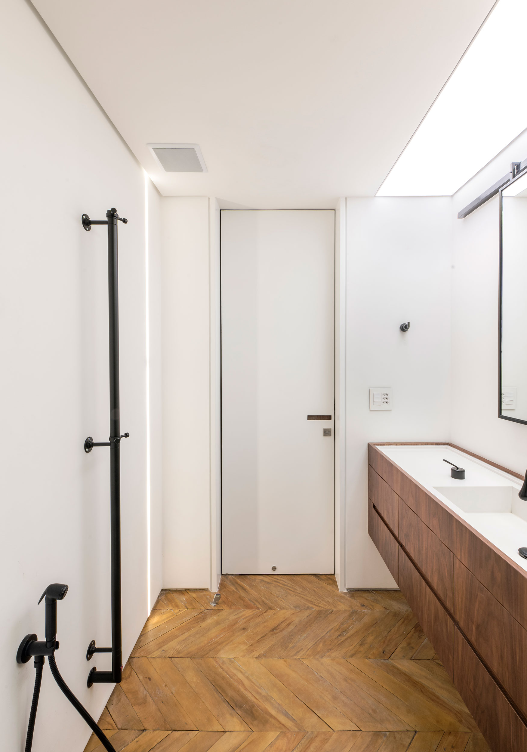 Apartamento com metragem quadrada reduzida e grande aproveitamento dos espaços. A integração do terraço com a área interna e a conexão entre os ambientes, foram as premissas para a concepção do projeto. A importante definição dos materiais e mobiliários criou uma unidade de linguagem e uma conversa entre todos os espaços. Concreto, madeira de demolição e metal são os protagonistas. A ressignificação de alguns deles fez parte desse conceito, como a lona de caminhão na cabeceira e a tubulação de gás no lustre do jantar. Além dos materiais, os desenhos, que desenvolvemos exclusivamente para esse apartamento, da estante metálica e do banco, são peças fundamentais. O banco do jantar se transforma em escrivaninha, já a estante metálica vazada, conecta o living com o quarto. Os painéis em marcenaria possuem também uma função importante, a área de serviço fica escondida atrás deles, sem precisar deixá-la exposta.